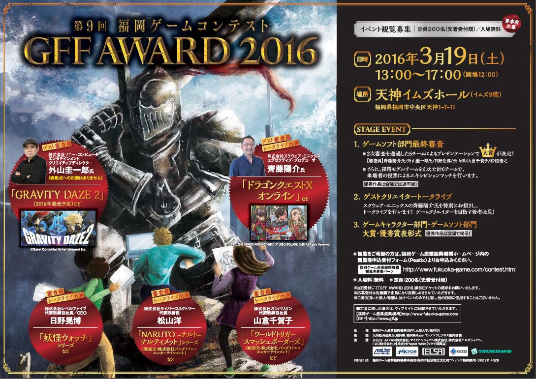 | 3月19日(土) | GFF | 第9回ゲームコンテスト GFF AWARD2016 |